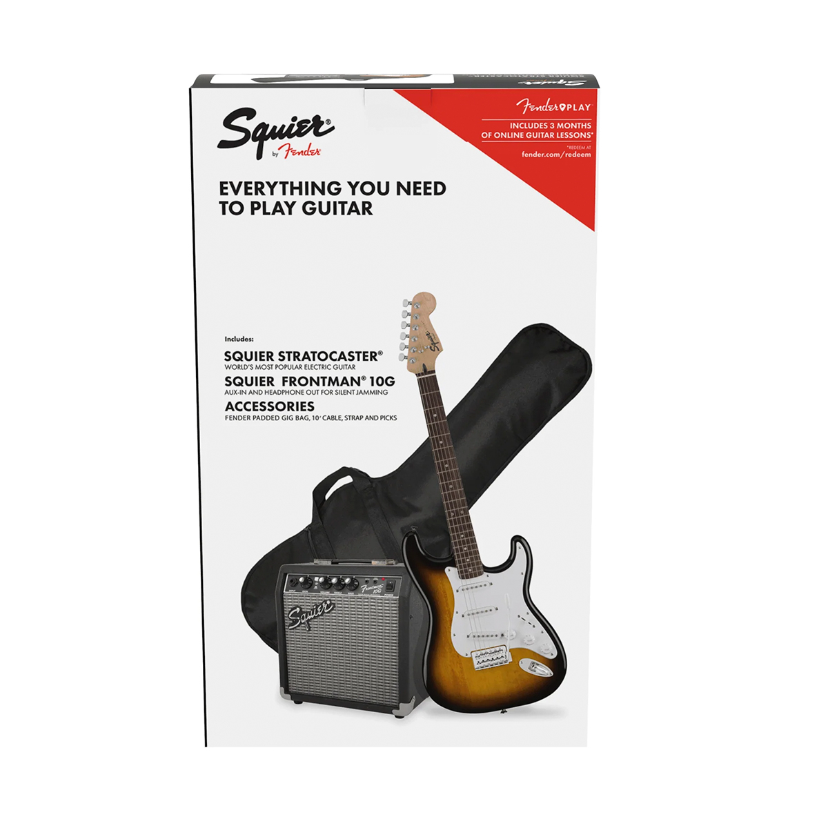 - Accesorios incluidos Amplificador Squier Frontman 10G, funda acolchada Fender, correa de guitarra Fender, cable de instrumento Fender de 10′, púas de guitarra Fender, suscripción de 3 meses a Fender Play ™.