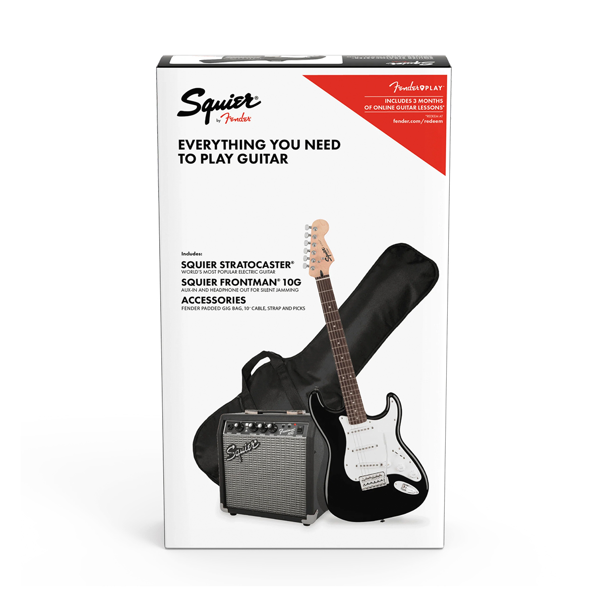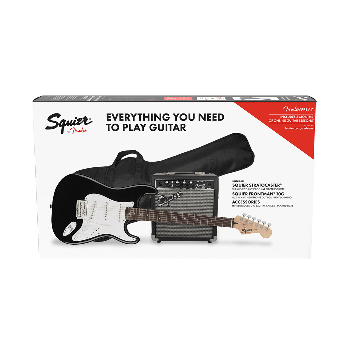 - Accesorios incluidos Amplificador Squier Frontman 10G, funda acolchada Fender, correa de guitarra Fender, cable de instrumento Fender de 10′, púas de guitarra Fender, suscripción de 3 meses a Fender Play ™.